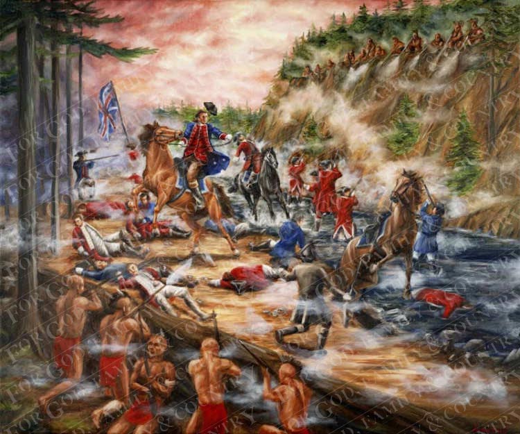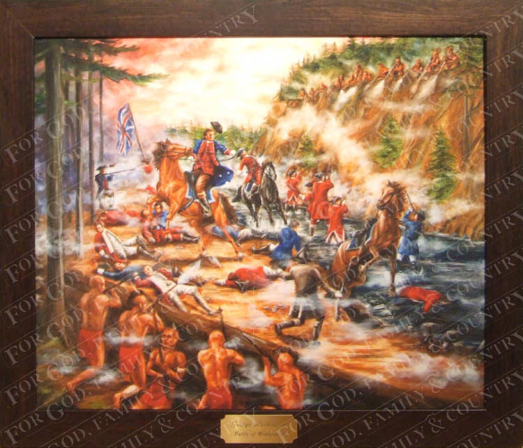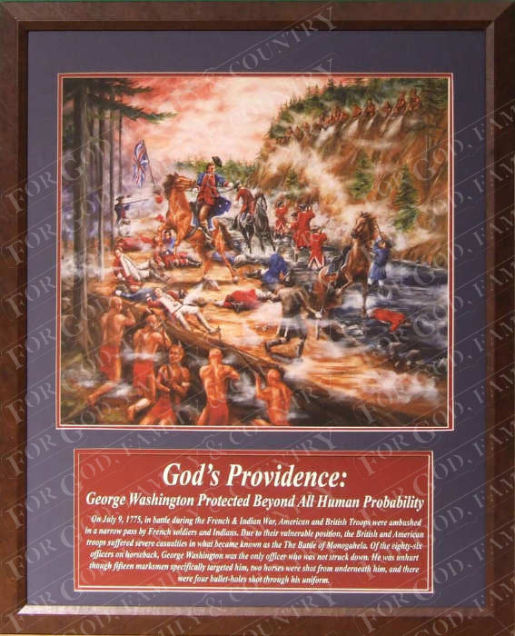 This actual historical event is colorfully displayed by artist Audra Esch. The painting brilliantly depicts the fierceness of the battle but it does more. For as the caption explains - and a close look at the painting portrays – that by GOD’s Providence, George Washington was protected beyond all human probability. George Washington, who was indispensable in the founding of the American nation, suffered no wounds during the Battle of Monongahela, even though eighty-five of his fellow officers on horseback were struck down. He was uninjured though fifteen enemy marksmen specifically targeted him, four bullet-holes were shot through his uniform, and two horses were shot from underneath him. The LORD most certainly protected him.